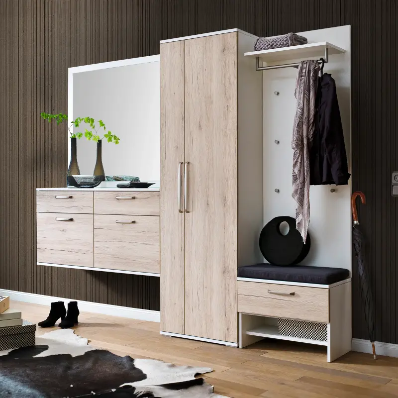 Front und Korpus weiß, Absetzung Eiche Nachbildung, best. aus: Schuhschrank 01110355 Maße: B/H/T ca. 89x118x37 cm.Schuhbank 01110355.02 Maße: B/H/T ca. 96x51x40 cm. Garderobenpaneel 01110355.04 Maße: B/H/T ca. 96x147x29 cm.Garderobenschrank 01110355.05 Maße: B/H/T ca. 59x199x40 cm.Spiegel 01110355.01 Maße: B/H/T ca. 87x60x3 cm.Artikel auch Einzeln erhältlich!