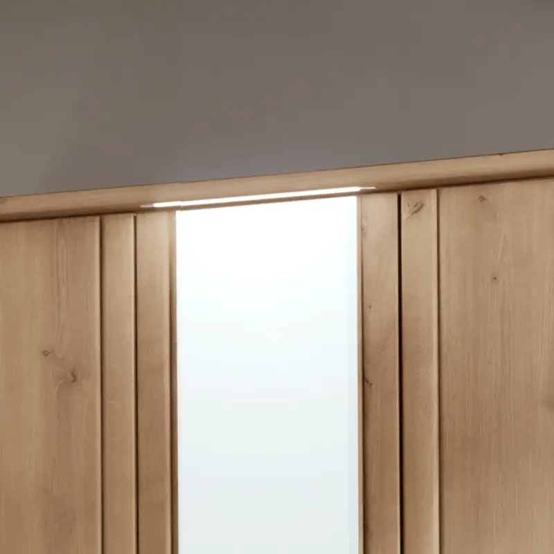 Bianco-Eiche Nachbildung, 3-türig, 1 Spiegeltür, inklusive Kranzleiste. Maße: B/H/T ca. 150x197x58 cm. Gegen geringen Mehrpreis: Beleuchtung.