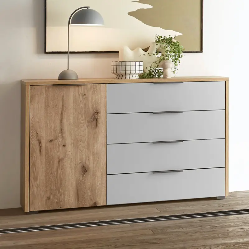 Front-Kombi Viking Oak Nachbildung/hellgrau, inklusive 2 Nachtkonsolen mit Paneelen und LED-Beleuchtung, mit Touchfunktion, Kopfteil gepolstert. Maße: B/H/T ca. 296,6x99,1x214,8 cm | Liegefläche ca. 180x200 cm. Diese Möbel enthalten eingebaute LED-Lampen. Die LEDs können nicht ausgetauscht werden. Gegen geringen Mehrpreis: Lattenroste, Matratzen und Bettzeug.