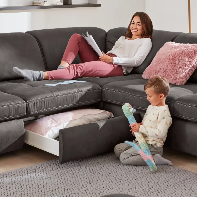 Praktisch für Kissen und Decken: Der Stauraum-Schubkasten. Gegen geringen Mehrpreis.