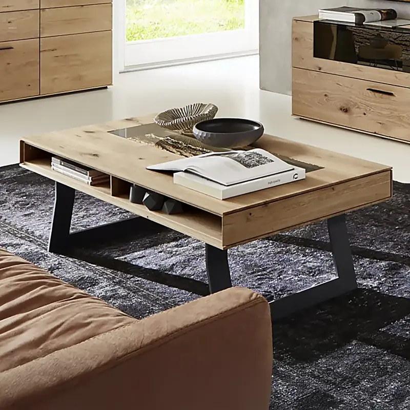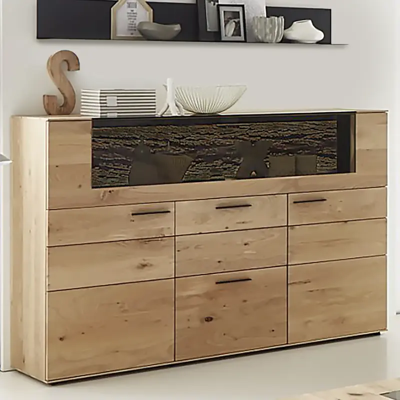 Kerneiche natur massiv, Oberfläche gebürstet, Applikation aus echter Rinde, Absetzung Metall anthrazit, best. aus: Unterteil, Wandpaneel und Regalelementen. Maße: B/H/T ca. 265x213x20-49 cm.
