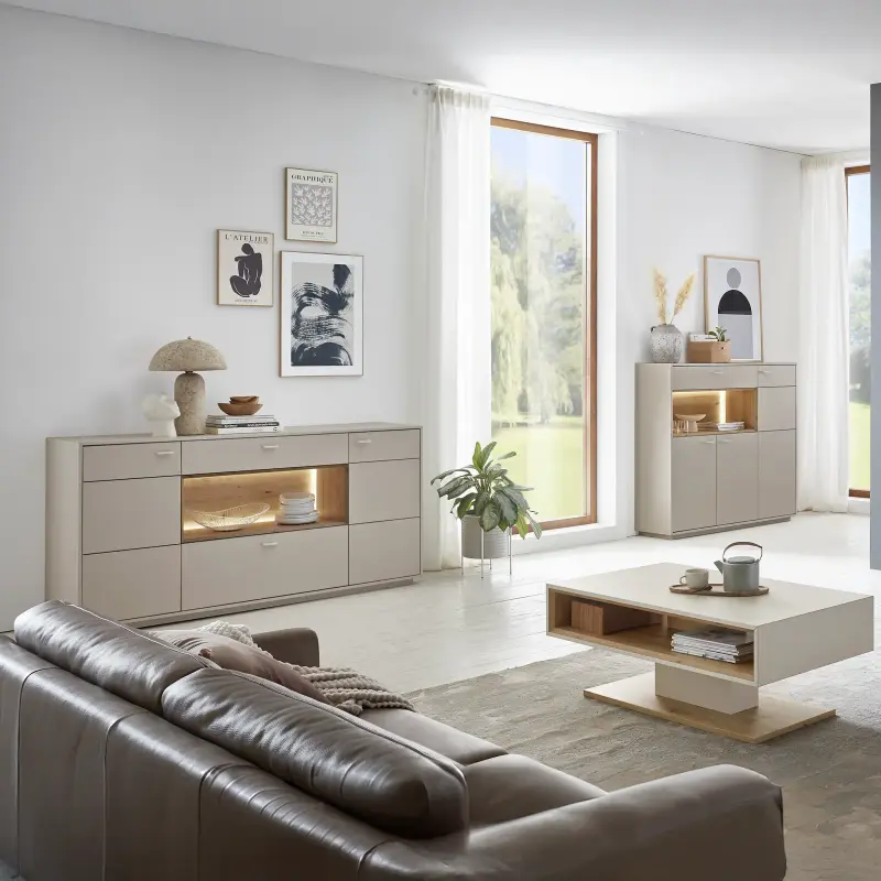 Front/Korpus: kaschmir Melamin, Absetzung Eiche Artisan Nachbildung. Maße: B/H/T ca. 110x45x65 cm.