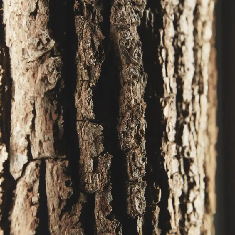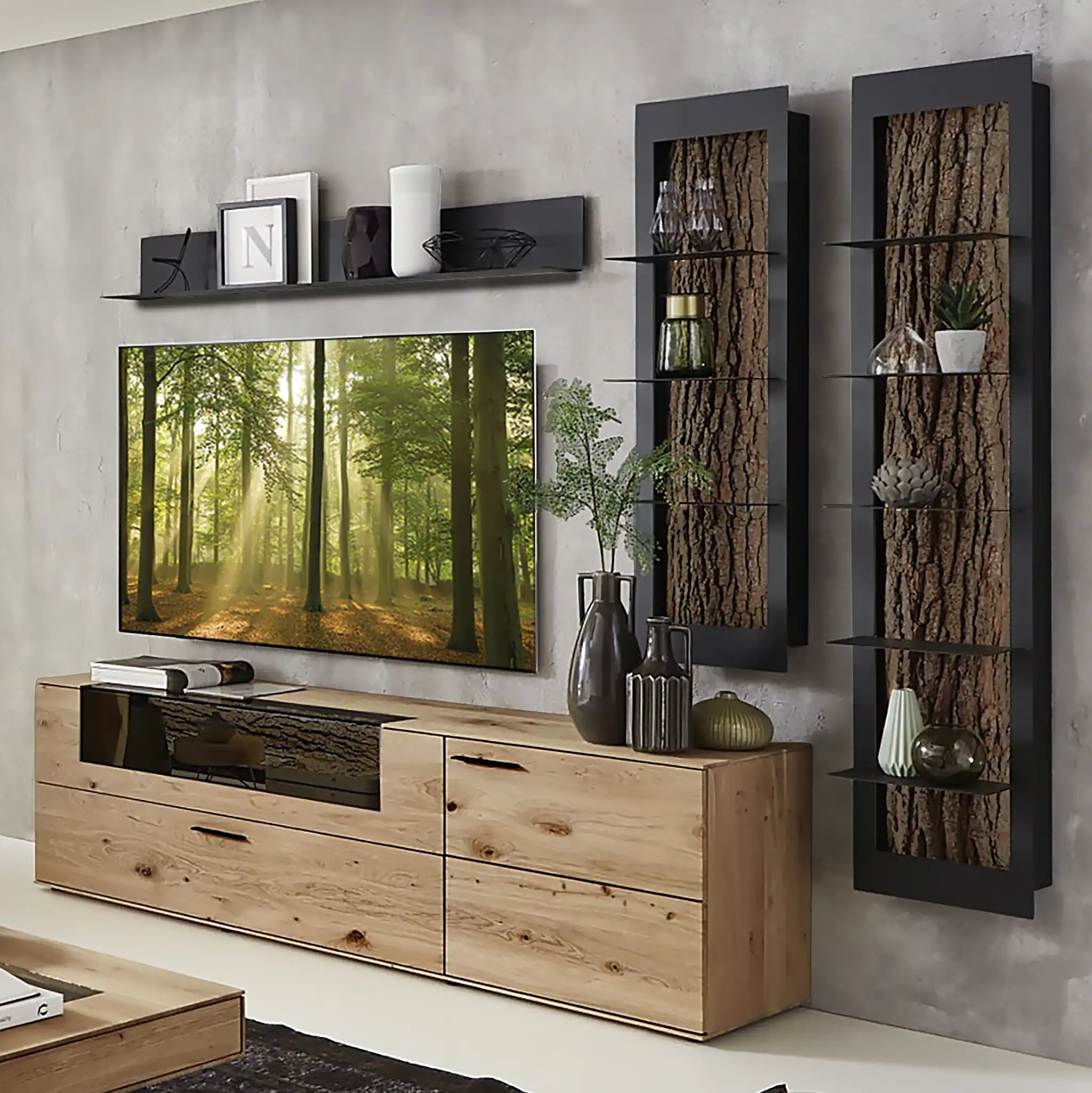 Kerneiche natur massiv, Oberfläche gebürstet, Applikation aus echter Rinde, Absetzung Metall anthrazit, best. aus: Unterteil, Wandpaneel und Regalelementen. Maße: B/H/T ca. 265x213x20-49 cm.