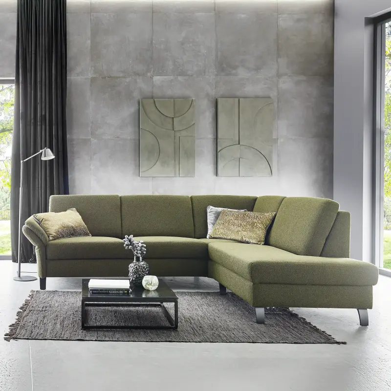Bezug: Q2 Life Olive, Fuß: Metallfuß schwarz, best. aus: Element 2-sitzig mit Armteil links, 4-fach klappbar und Anbausofa rechts. Maße: Stellmaß ca. 265x195 cm. Gegen geringen Mehrpreis: Zierkissen.