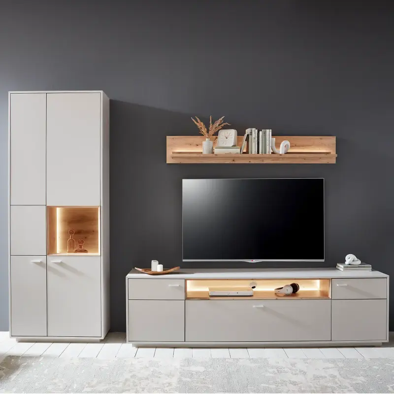Front/Korpus: kaschmir Melamin, Absetzung Eiche Artisan Nachbildung, inkl. Beleuchtung, best. aus: Vitrine mit 1 Holz- und 1 Glastür, Wandboard mit 1 Wandpaneel und 1 Holzboden sowie Unterteil mit 2 Holztüren und 1 Schubkasten. Maße: B/H/T ca. 297,6x207,9x49,9 cm. Diese Möbel enthalten eingebaute LED-Lampen. Die Lampen können in der Leuchte nicht ausgetauscht werden.