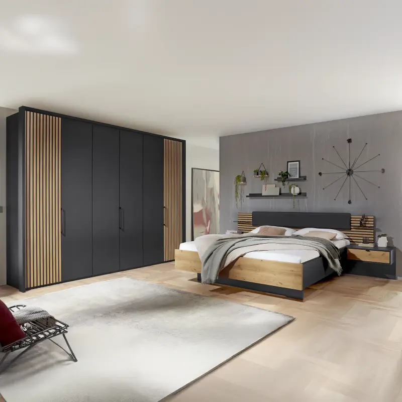 Korpus/Front: Graphit Dekor, Außentüren mit Lamellen in Bianco-Eiche, 6-trg., inkl. Passepartout in Korpusfarbton und Beleuchtung für Passepartout. Maße: B/H/T ca. 306,4x220x58 cm. Dieses Möbelstück enthält eingebaute LED-Lampen. Die Lampen können in der Leuchte nicht ausgetauscht werden.