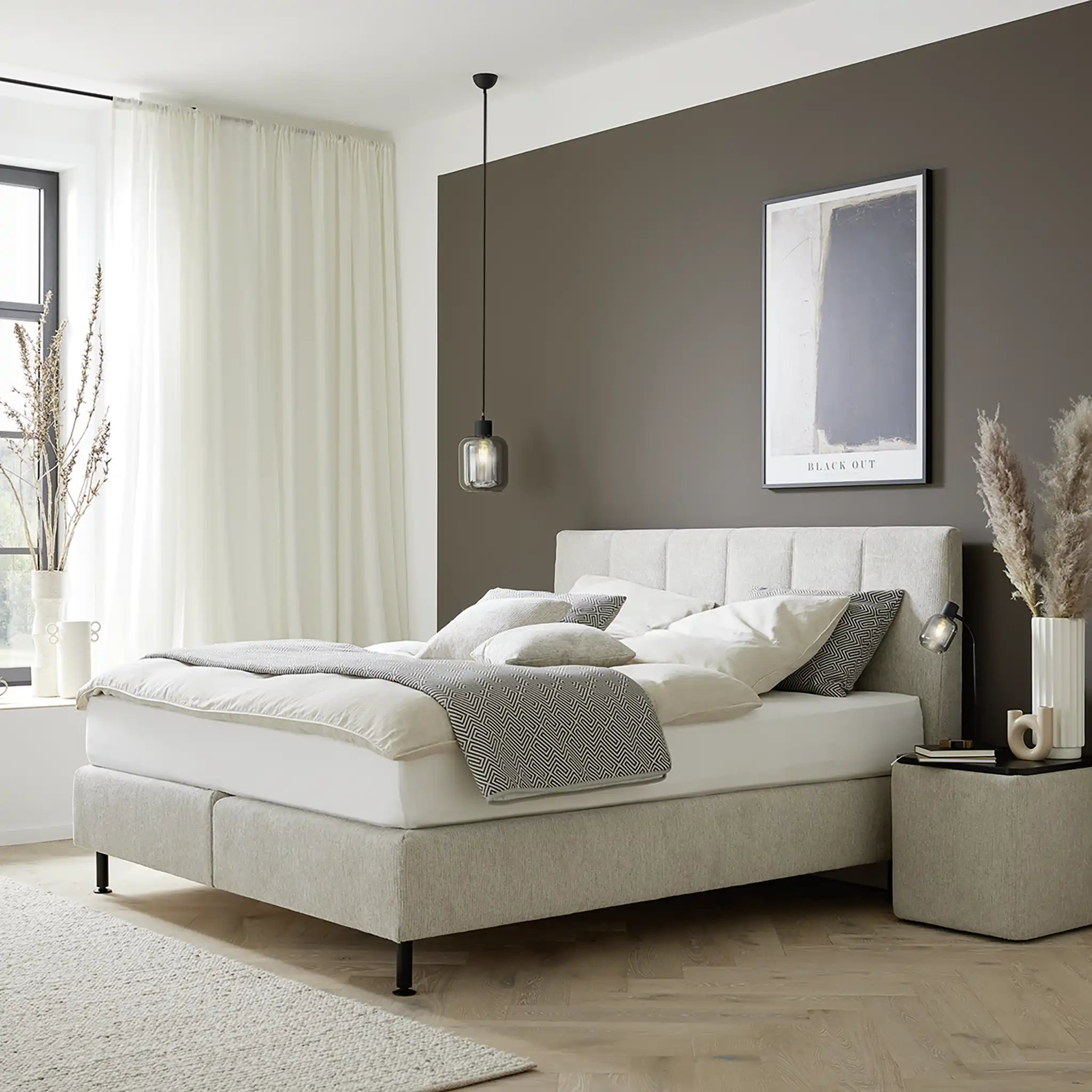 Bezug: Stoff Gomez, Fuß: Quadra schwarz, H: ca. 10 cm, Unterbau belüftet, 1 Taschenfederkern-Matratze ca. 140x200 cm, H: ca. 20 cm, inkl. Topper Schaum, H: ca. 6 cm, Kopfteil: abgesteppt. Maße: Liegefläche ca. 140x200 cm. Gegen geringen Mehrpreis: Bettzeug.