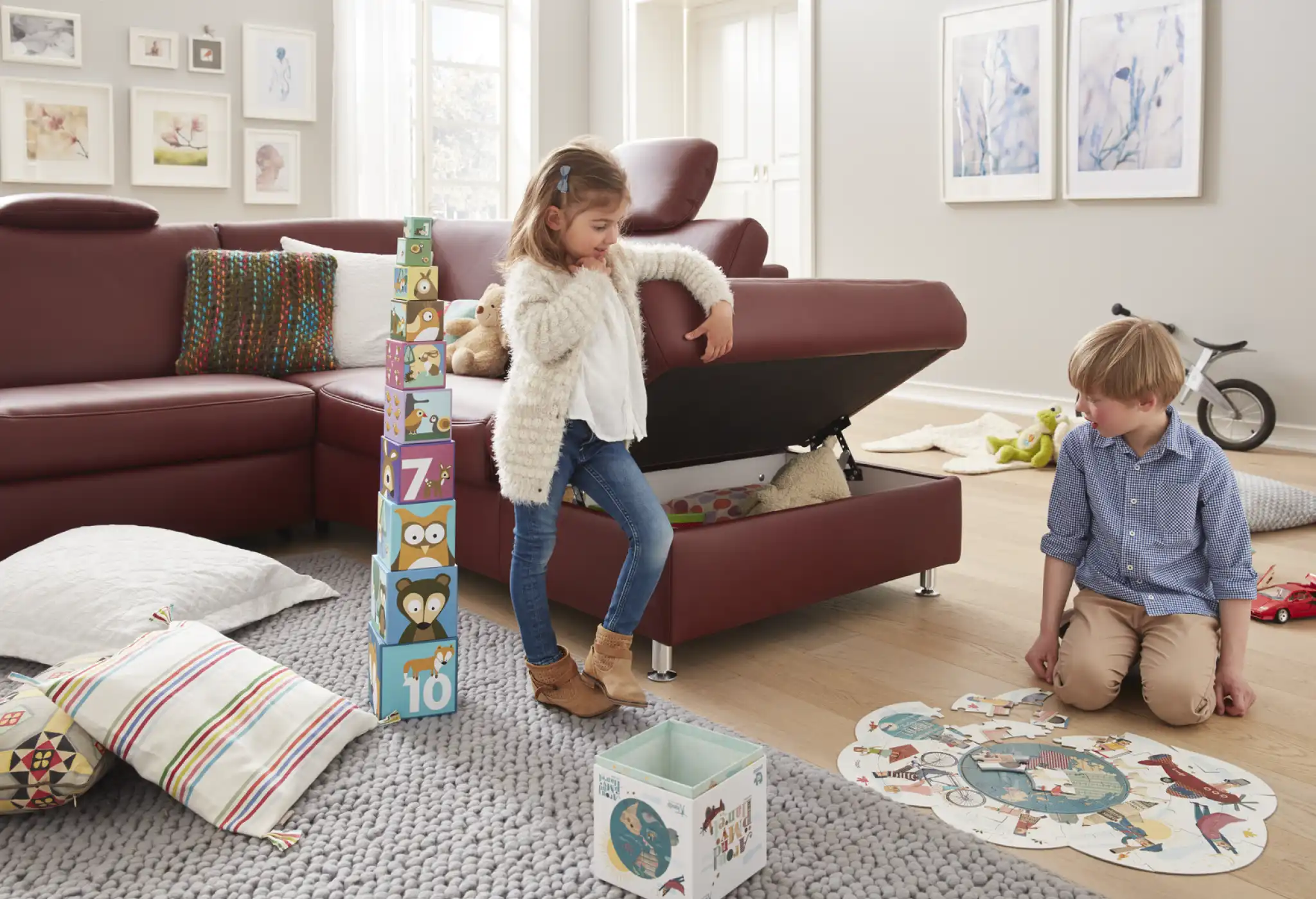 Unsere Familienmöbel verbinden robusten Komfort mit praktischen Stauraum-Lösungen und kinderfreundlicher Sicherheit.