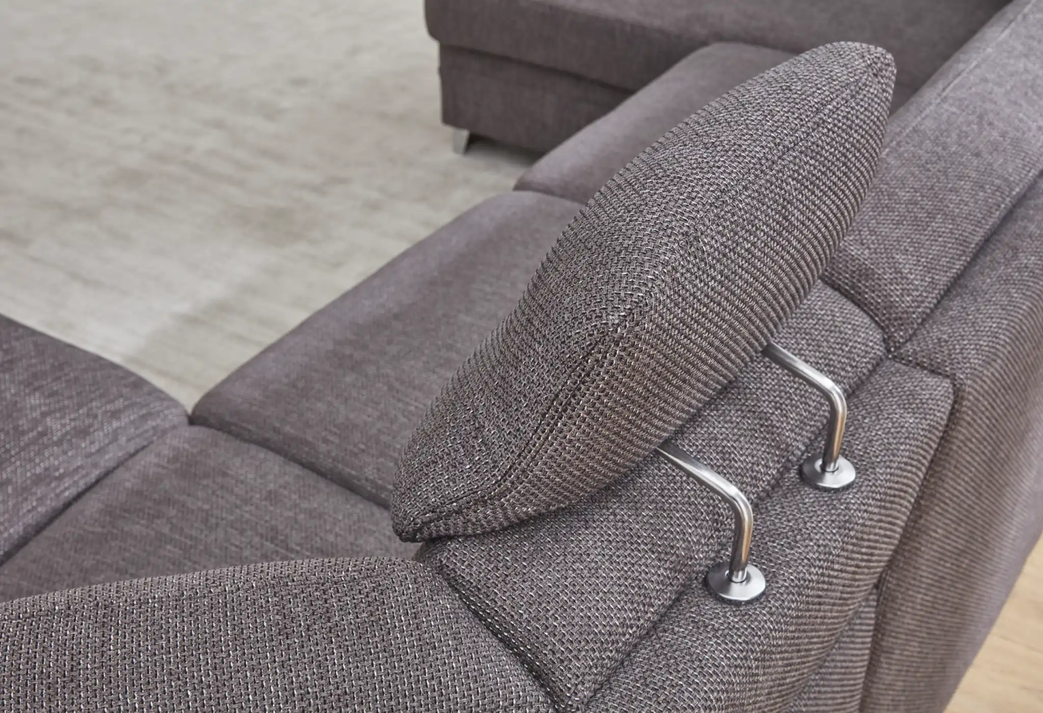 Bezug Stoff Taurus grau mit beigefarbener Kreuznaht, Holzfuß Eiche, best. aus: Canapé mit Armteil links, 2,5-Sitzer ohne Armteile, Rücken Spannstoff und 1,5-Sitzer-Kombielement mit Anstellhocker rechts. Gegen geringen Mehrpreis: Funktionen, Kopfstützen, Zierkissen und Zierdecke. Stellmaß: ca. 167x313x235 cm.