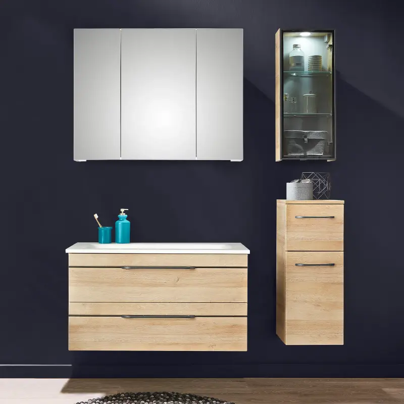 Front und Korpus Riviera Eiche Nachbildung, Griffe und Zierleisten schwarz, best. aus: Spiegelschrank 3-türig, einfach verspiegelt, inklusive Einbau LED-Waschplatzbeleuchtung und LED-Aufsatzleuchte, Maße: B/H/T ca. 90x70x17 cm, Glaskeramik-Waschtisch und Waschtisch-Unterschrank mit 2 Auszügen, Maße: B/H ca. 90x70 cm.