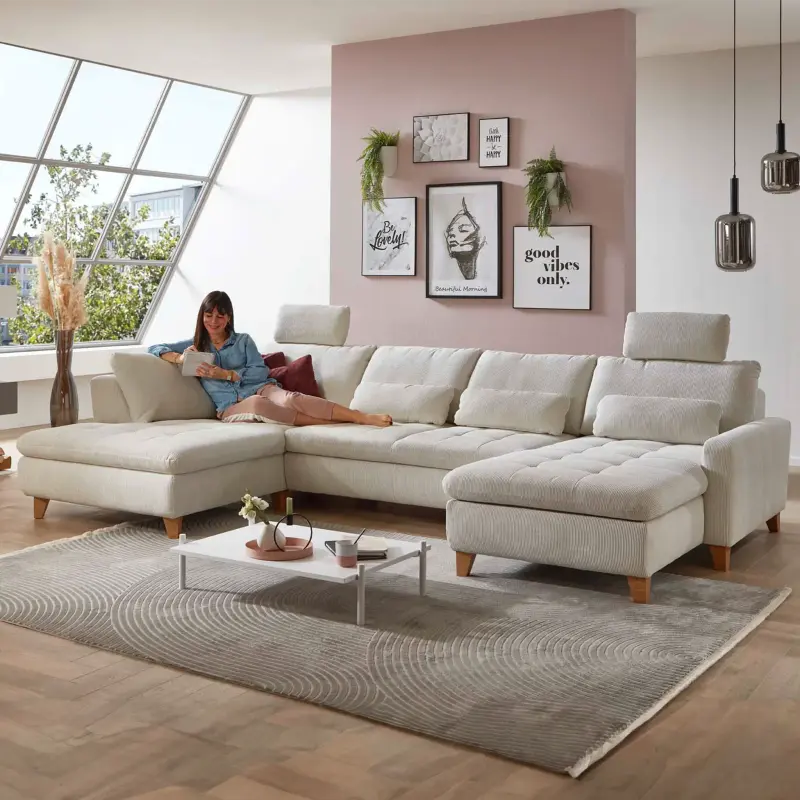 Bezug/Absatzbezug Stoff Feincord natur, Holzfüße Buche oder Eiche bianco, best. aus: 2-Sitzer Kombielement mit Anstellhocker links, 2,5-Sitzer und Canapé mit Armlehne rechts. Gegen geringen Mehrpreis: Kopfstützen, Sitztiefenverstellung, Stauraum im Canapé, Schlaffunktion, Nierenkissen und Zierkissen. Maße: B/H/T ca. 197x344x183 cm.