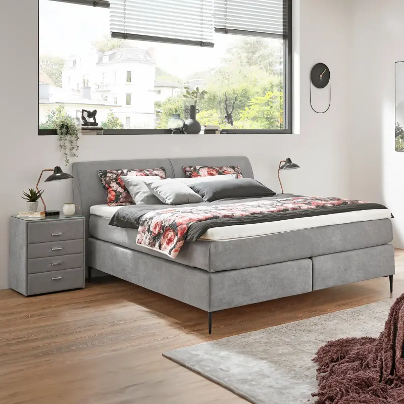 Bezug Stoff Enjoy grau und Alufuß schwarz matt, best. aus: Kopfteil mit Rücken unecht, Unterbau Bonell glatt, 2x 7-Zonen-Taschenfederkern-Matratze mit Matratzenbezug im Ganzen inklusive durchgehendem Kaltschaum Topper. Maße: Liegefläche ca. 180x200 cm. Gegen geringen Mehrpreis: Bettzeug und Nachttisch.