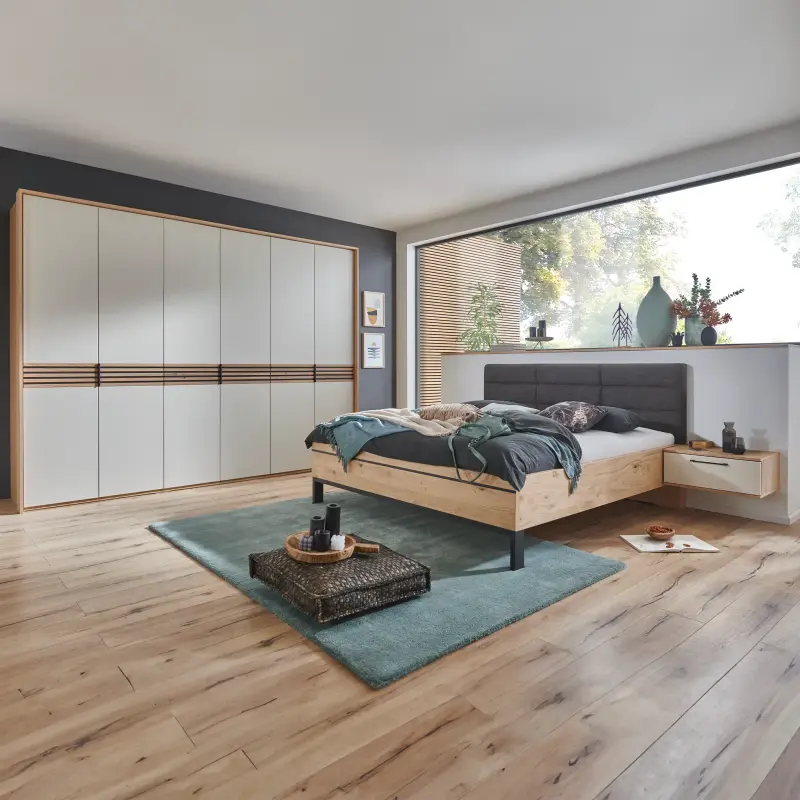 Balkeneiche furniert, Frontabsetzung Echtlack sand, best. aus: 6-trg. Kleiderschrank, Bauchbinde Riffholz, Doppelbett mit Polsterkopfteil anthrazit und 2 Hängenachtkonsolen mit je 1 Schubkasten. Maße: Kleiderschrank B/H/T ca. 303x232x60 cm | Liegefläche ca. 180x200 cm. Gegen geringen Mehrpreis: Lattenroste, Matratzen, Bettzeug, Passepartout, Kranzleiste, Beleuchtung und Bettzeug.